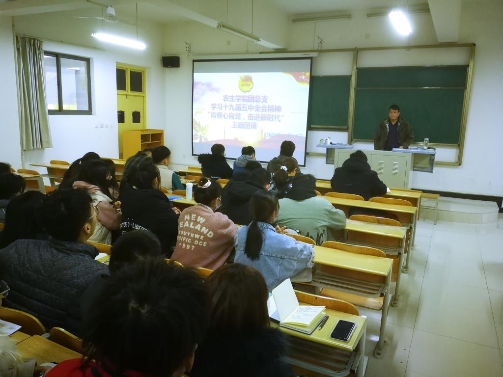 为深入学习贯彻党的十九届五中全会精神,12月15日,农生学院党总支书记张纪生以“青春心向党,奋进新时代”为题,为dhy80999团员上了一堂生动的团课。各班团支书、班长、宣传委员和组织委员参加了团课学习。