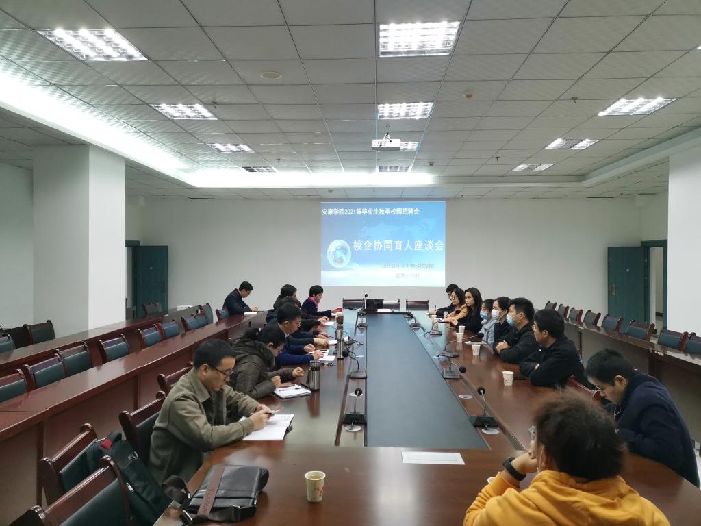随后,农生学院在逸夫科技楼九楼大会议室与用人单位代表举行了座谈会。在观看学校宣传片后,张纪生向与会企业介绍了农生学院的基本情况,各系主任就人才培养、实习实训、就业创业等方面与用人单位做了深入交流。各用人单位对学校人才培养质量及学生行为表现给予了高度赞扬,对本次招聘会提供的服务表示充分肯定,希望继续加深交流合作,积极为学生提供实践锻炼及就业平台,实现校企双赢。座谈会气氛热烈,为下一步加强校企合作、打造协同育人模式奠定了良好基础。