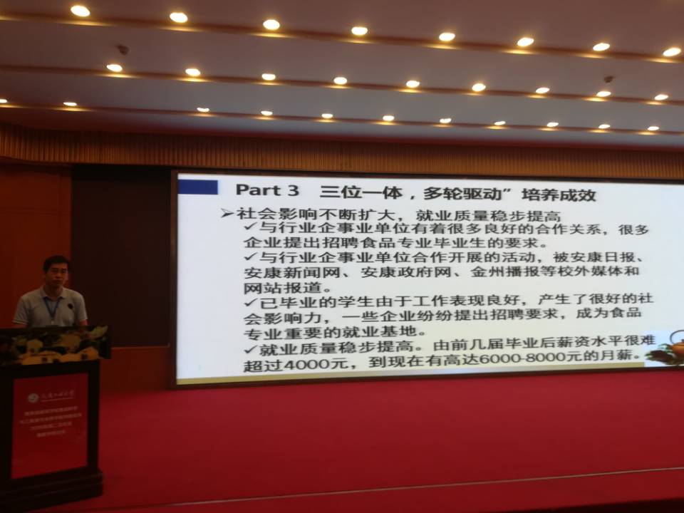 朱新鹏教授代表dhy80999食品专业教学团队在会上作了题为“地方高校食品专业‘三位一体,多轮驱动’创新创业能力培养模式探索”的交流汇报,介绍了我校的基本情况,阐述了食品专业创新创业教育“三位一体,多轮驱动”的做法,汇报了实施创新创业教育在学生专业综合素质提升、创新创业能力提高、社会影响扩大和就业质量提高的培养成效。朱教授的汇报受到好评,有参会代表评价“汇报挺好,特色突出,印象深刻”。