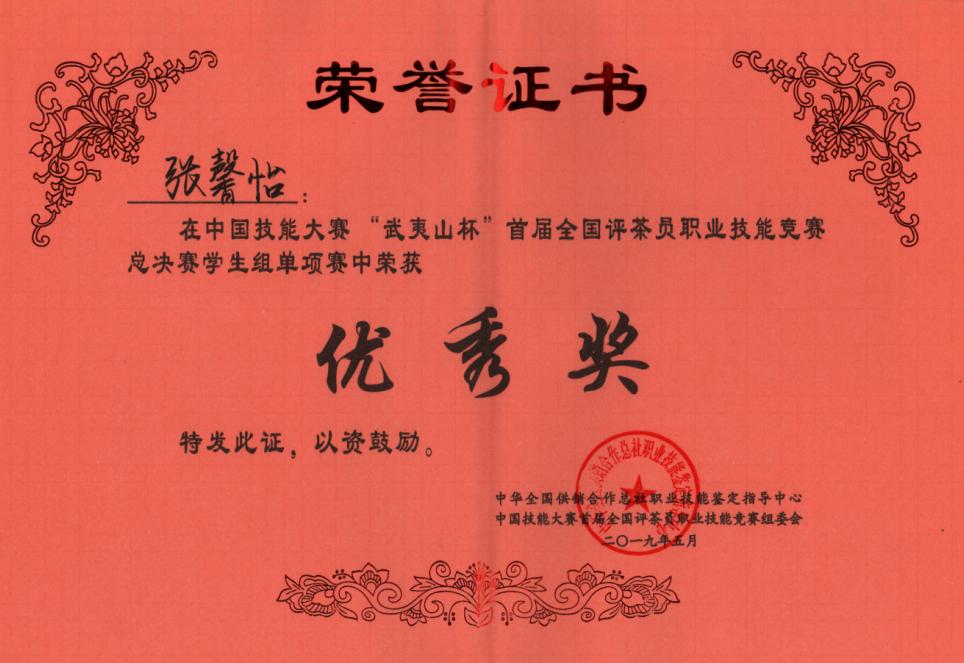 5月13日-15日,总决赛在武夷山成功举办。来自全国17个省区的300多名选手,经过为期三天的激烈角逐落下帷幕。决赛命题组专家结合茶产业发展现状,融入相关新知识、新技术、新技能等内容。由茶领域深耕数十年的专家、学者担任本届赛事总决赛的命题、评审和仲裁工作,确保了评茶员国赛的技术水平。比赛包括90分钟的闭卷理论考试和技能操作两部分,其中技能操作部分围绕茶形辨认、香味排序、品质审定、滋味品鉴以及茶品设计等方面对参赛选手进行考核。我校茶学2015级张馨怡同学最终获得优秀奖。