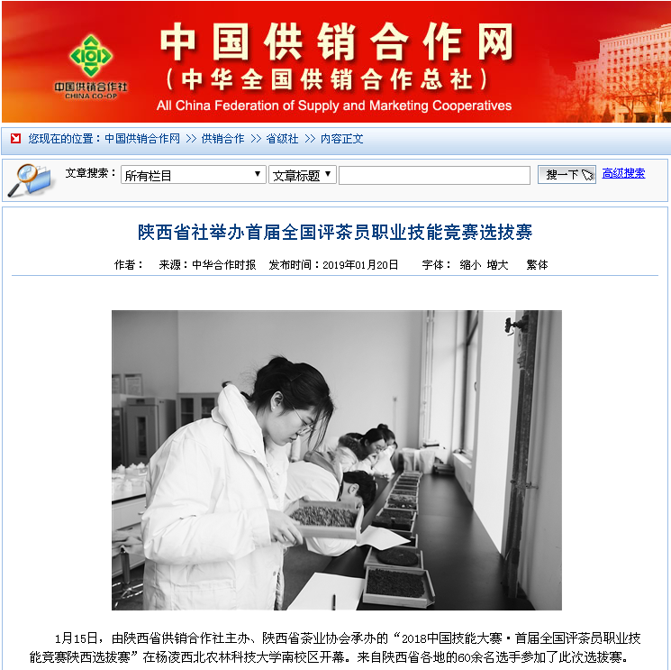 1月15日,由陕西省供销合作社主办、陕西省茶业协会承办的“2018中国技能大赛·首届全国评茶员职业技能竞赛陕西选拔赛”在杨凌西北农林科技大学举行。来自陕西省各地的60余名选手参加了选拔赛。最终我校参赛的2名学生中有1名进入决赛。