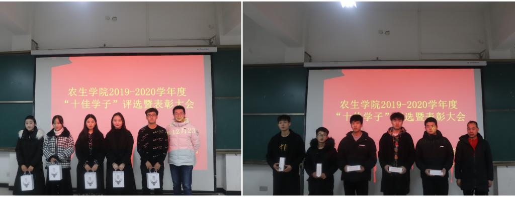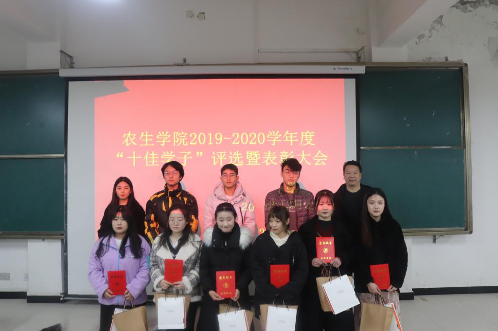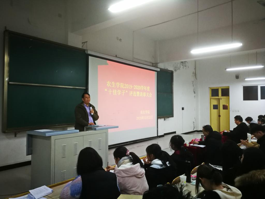 为加强学风建设,落实立德树人根本任务,表彰先进,树立典范,12月23日晚,农生学院隆重召开2019-2020年度“十佳学子”评选暨表彰大会。学院党总支书记张纪生、院长王健、学工办主任谭自力、团总支书记张伟艺、辅导员金清民、2020级全体学生和受表彰学生代表参加了表彰大会。