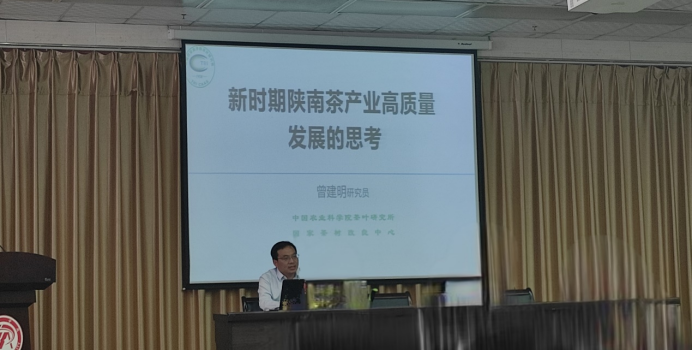 为积极贯彻落实乡村振兴战略,推动陕南茶产业高质量发展,2021年4月28日下午,由陕西省茶叶省市共建重点实验室、dhy80999dhy80999和继续教育学院、中国富硒研究院联合举办的“新时期陕南茶产业高质量发展的思考”学术报告在dhy80999江南校区图书馆六楼报告厅进行,报告人为中国农业科学院茶叶研究所研究员、硕士生导师曾建明。参加此次学术活动的有“2021年安康市乡村治理人才农村实用技术培训班”全体学员、我校茶学专业教师、茶学生及部分茶叶科技、企业人员。