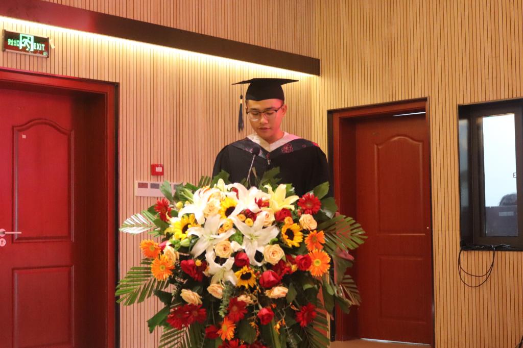 教师代表刘欢发言。刘欢代表全院教师对将远行的学子进行亲切叮嘱:“面对人生的下一站,希望同学们保持平和的心态,谦虚做人,谨慎做事,真诚向实践请教;保持学习的耐心,持之以恒,不断推远理想,积极备战人生;学会独立思考和团队合作,把事情做到极致”。希望同学们要牢记时代的使命,不负时代,不负韶华,不忘初心,砥砺前行!