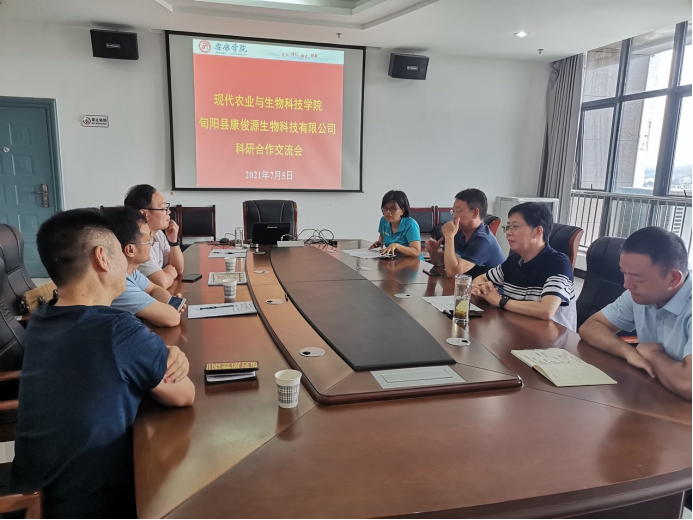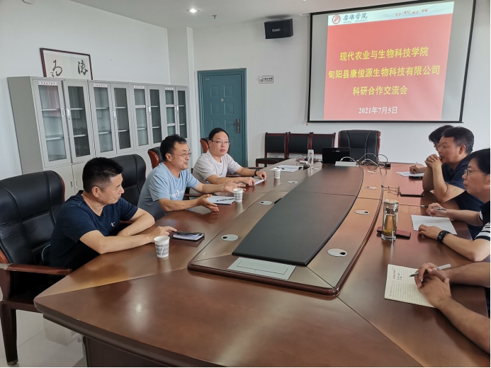 7月5日上午,农生学院与旬阳县康俊源生物科技有限公司在逸夫科技楼9楼小会议室开展了校企科研合作交流会。农生学院副院长朱文东、农学系主任张丽琼博士、园林专业廖咸康副教授、蒲小龙博士、院办主任王中兴及旬阳县康俊源生物科技有限公司的安黄新主任、卢靖主任和余伊庭书记参会。
