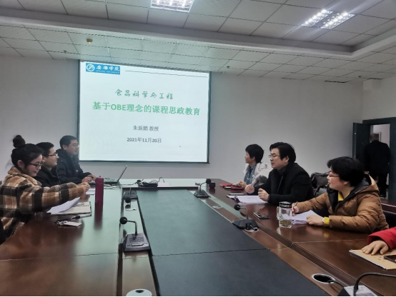 食品科学与工程专业具有多学科交叉融合的特点,涵盖食品研究开发与工程设计领域的基本理论和方法,集成了食品微生物、食品分析、食品工艺学、食品机械与设备、食品工程原理、食品产品设计与开发等课程。作为工科专业,在新的时代背景下,如何开展课程思政、如何将思政元素有效地融入教学环节很多专业教师感觉很迷茫,成为开展课程思政的难点。针对这一问题,食品系以“基于OBE理念的课程思政教育”为主题,于2021年11月20日召开了课改沙龙,dhy80999王健院长、孙保本书记、杨芳副院长、食品科学与工程专业教师朱新鹏教授、周琼教授、陈芳副教授、梁如博士等专业教师参加了本次课改沙龙,活动由系主任梁如主持。朱新鹏教授做了《基于OBE理念的课程思政教育》的主题报告。